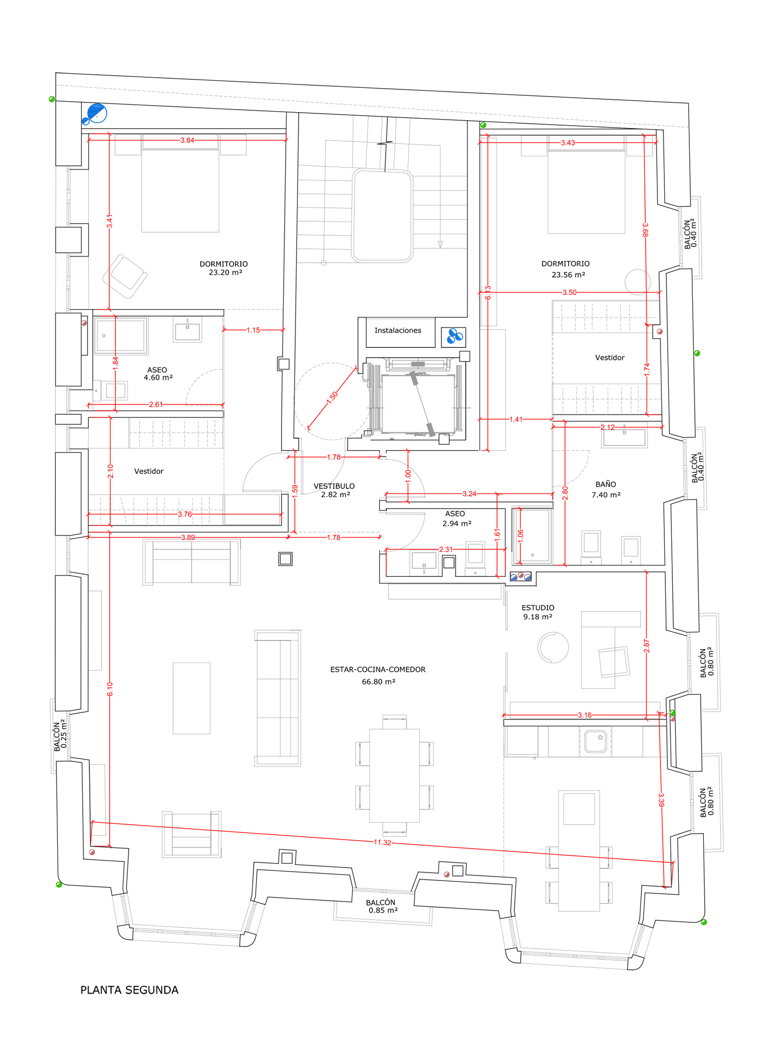 En cuanto a equipamiento, dispone de servicios centrales de calefacción y agua caliente con contadores individuales, calefacción por suelo radiante por agua, sistema de aerotermia y certificado energético letra A. Incorpora además sistema de renovación de aire, estores automáticos, alarma y altavoces bluetooth empotrados en todas las estancias, así como iluminación led empotrada y una cuidada rehabilitación de los elementos comunes, con una elegante escalera original.